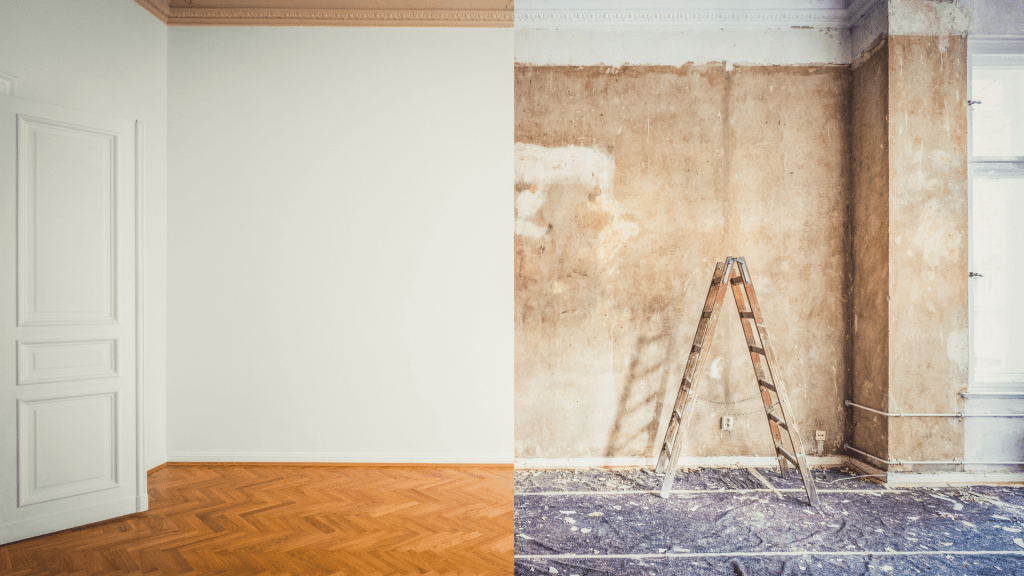 Le deuxième espace, initialement en cours de démolition avec des murs endommagés, a été rénové pour devenir une chambre moderne avec des murs fraîchement peints et un sol en parquet. Les travaux ont inclus la réparation des murs, la peinture et l’installation de nouveaux revêtements de sol.
