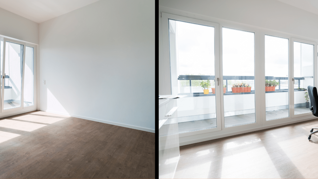 La dernière pièce a été transformée d’un espace vide et inachevé en un bureau lumineux et moderne. Les travaux ont inclus l’installation de grandes fenêtres, d’un sol en bois, et l’aménagement d’un accès à un balcon.