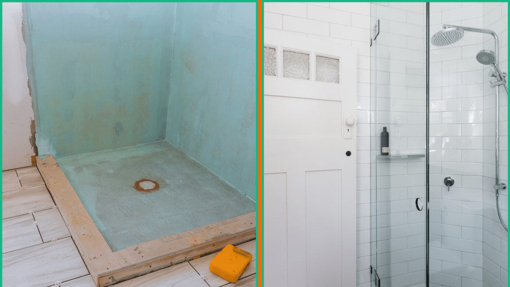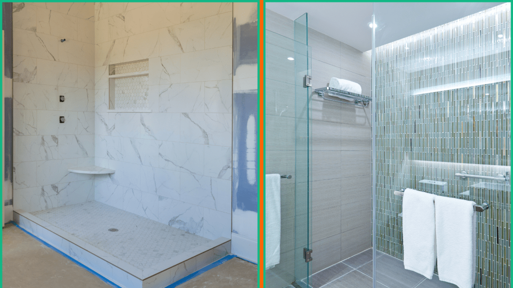 Avant les travaux, la douche avait des murs carrelés en marbre avec des raccords de plomberie exposés. Après rénovation, la douche est équipée de carreaux modernes, d’une paroi en verre et d’un éclairage LED intégré, apportant une touche contemporaine. Les accessoires, tels que les étagères et les porte-serviettes, ont été installés pour une fonctionnalité optimale.