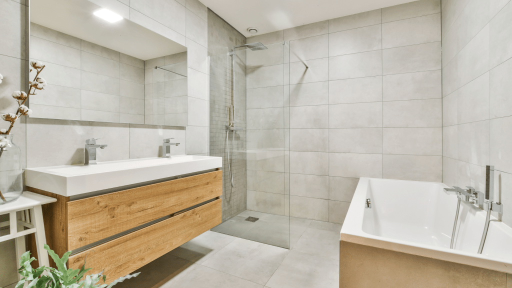 Cette salle de bain rénovée présente des carreaux gris clair, un meuble-lavabo en bois, et une douche à l’italienne en verre. La baignoire spacieuse et l’éclairage moderne ajoutent une touche élégante et fonctionnelle.