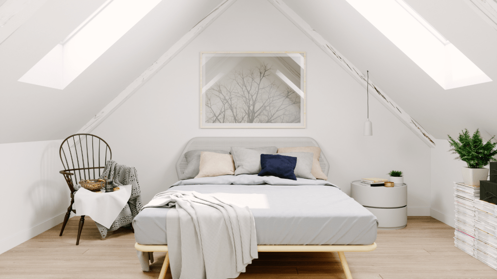 Voici une de nos rénovations de chambre à coucher. La pièce est aménagée avec un éclairage LED intégré, un lit avec tête de lit rembourrée, des rideaux épais pour l’intimité et une salle de bain adjacente visible à travers une paroi vitrée.